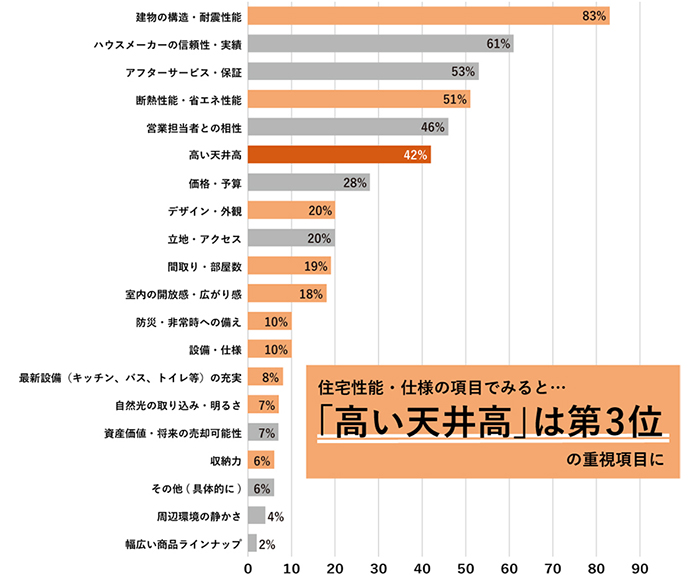 このように住まいづくりにおける必須条件が並ぶ中、特に注目したいのが、6位に「高い天井高」が入っている点です。住宅性能・仕様の項目でみてみると3位の重視項目になります。 天井高は、住宅性能やサービス体制などと比べると、検討初期では優先順位が高くなりにくい要素です。それにもかかわらず大きな支持を集めたのは、「実際に体験して初めて、本当の価値が実感できる」という、天井高ならではの魅力が現れた結果かもしれません。