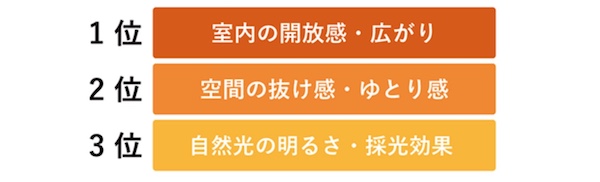 1位「室内の開放感・広がり感」、2位「空間の抜け感・ゆとり感」