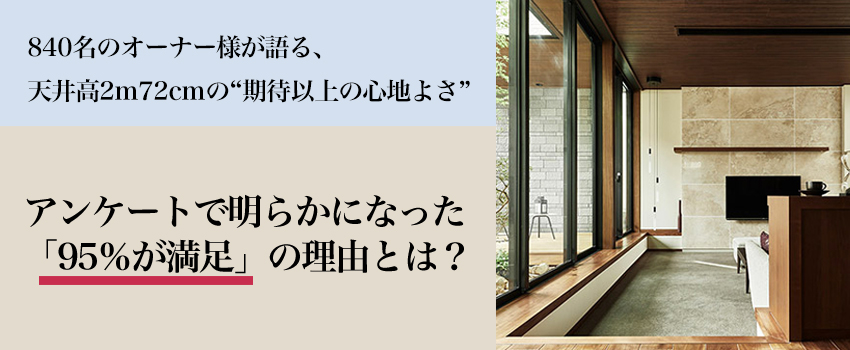 実際、一般的な住宅の天井高2m40cmよりも高い、天井高2m72cmを採用したオーナー様840名へのアンケートでは、図面や写真だけでは想像しきれなかった“高さがもたらす心の余裕”を実感したという声が数多く寄せられ、実に95%のオーナー様が、高い天井高に「満足感」を示しました。